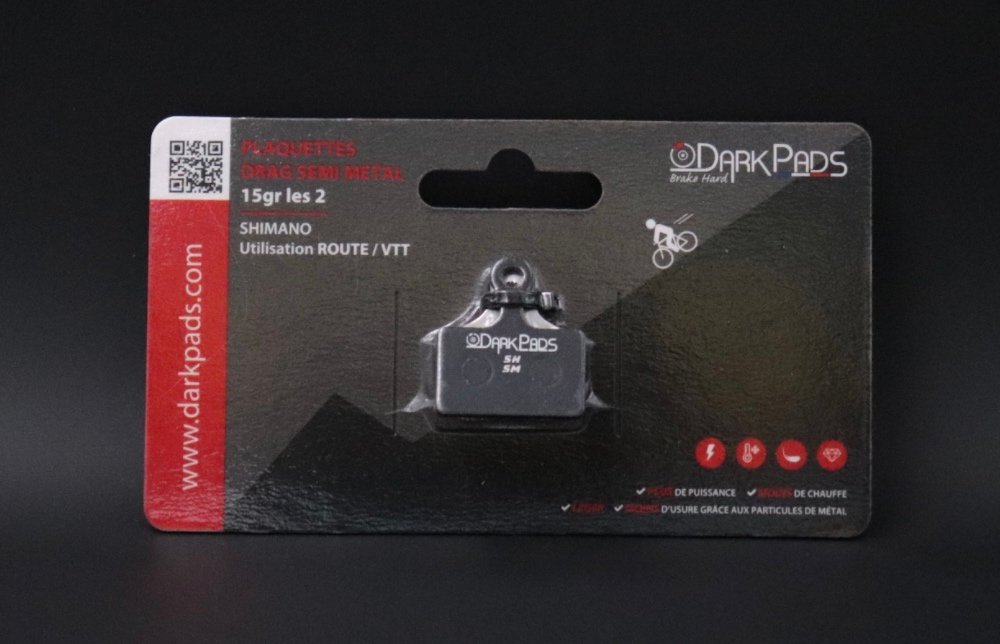 Plaquettes DarkPads Shimano 11 / 12V semi-métal,  sont la référence pour une meilleure longévité et une baisse de température en comparaison à la plaquette organique.