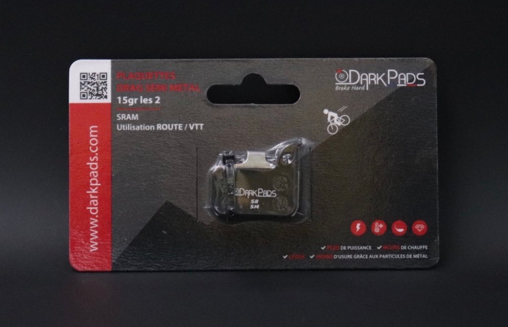 Les Plaquettes DarkPads SRAM 11V semi-métal, sont la référence pour une meilleure longévité et une baisse de température en comparaison à la plaquette organique.